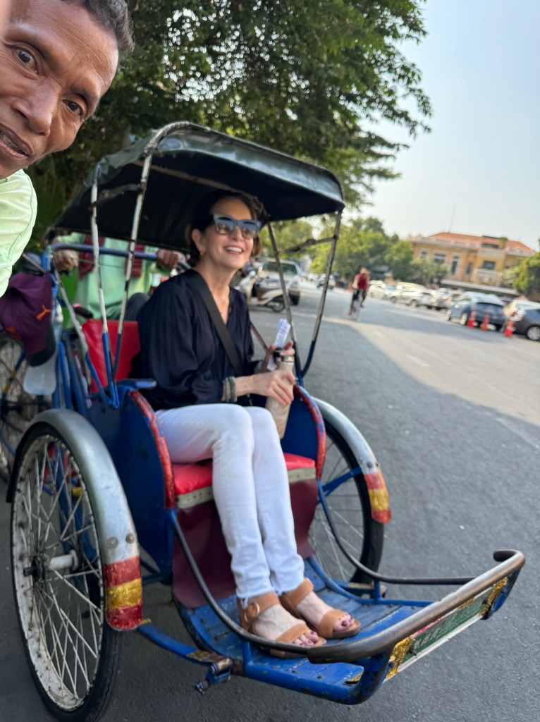 Valentines Day and our last day to be in Phnom Penh. Lisa scheduled a last minute architectural tour wanting to see the French Colonial buildings that dot the area around our hotel. Our guide named Votey, who speaks excellent non-Khmer-glish English, shows up to the hotel to greet us. Votey is an architect but gave up her career to study and teach idiots like us about Cambodian architecture. The tour is provided by the Khmer Architecture Organization. This is not a typical architecture tour. No, this is a tour using cyclos. Cyclos are rickshaw bicycles and there are three of them lined up in the front of hotel, one for Lisa, one for me and one for Vetoy along with the three cyclo pedalists standing at attention. (This is Votey below)