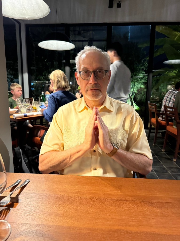 The problem is that it’s so hot, the deck really isn’t much of an option. I remind you it’s February. Lisa decides to chill in the room and I take off for a massage, which was wonderful. At one point I had to look up because I was sure this little Cambodian woman massaging me was part octopus. It felt like four people were working on me. I was relaxed and the little kink in my lower back disappeared. All good. After a bit more chill, we asked for a tuk-tuk to take us to dinner. Two more cold towels and we were on our way to Wat Damnak, in my view the best meal on our trip. When you go to Siem Reap, you must eat there! Lisa had the regular set menu and I had the vegetarian set menu. The cost, $48 per person for a meal that would have been $250 per person in the states. I had to stop at Miss Wong’s for a nightcap. Cool place, but mostly empty.