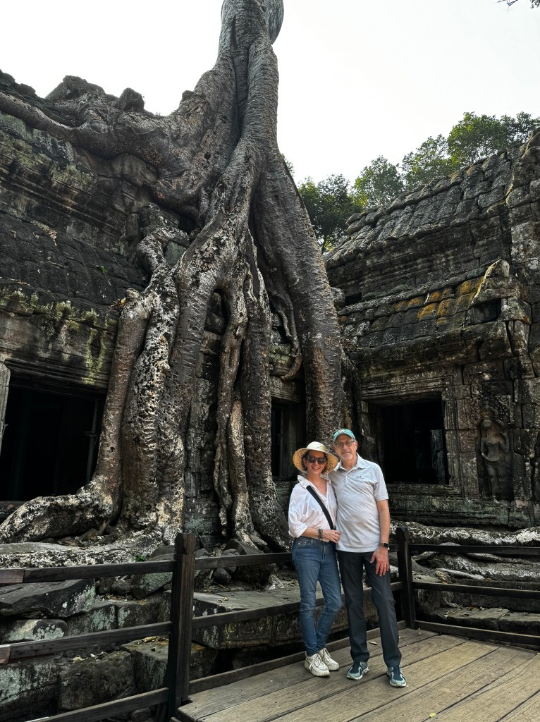 Rom was a wealth of information. I don’t understand how anyone can tour Angkor Wat without a guide. (Caveat: anything I got wrong here is his fault. I take no blame. I’m just a gullible tourist who doesn’t know better.) There are several smaller temples within Angkor Wat and after touring the main temple we went to see J7’s Bayan Temple, the famous one that had trees and tree roots growing in and throughout the walls. It’s where Angelina Jolie filmed Lara Croft: Tomb Raider. (I’ll bet she stayed at Amansara.). Here’s a photo of Brad Pitt and Angelina Jolie when they were there.