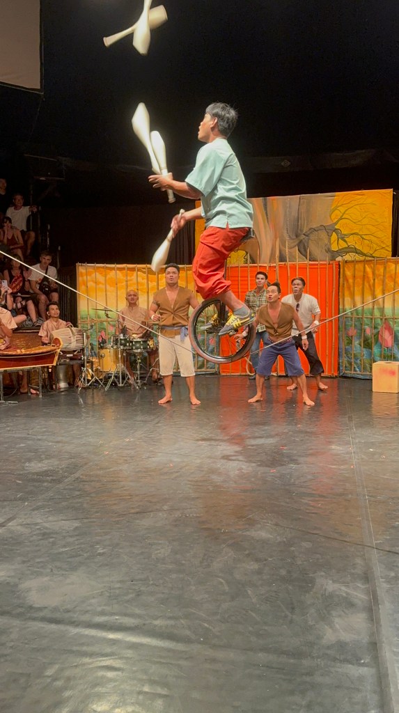 As soon as they seat us in the front row, I leaned over to Lisa and whispered, “I don’t want to be part of the show.” Well, that was prescient. In the very first routine, one of the performers, the comical one, lands right in my lap. Fortunately, they didn’t drag me onto the stage. I just had to look surprised and then help him get down, which I did with theatrical aplomb. The performers were fantastic and more than a few were notably gender fluid (wasn’t expecting that in the middle of Cambodia). I’m also quite sure one was a eunuch. He was doing splits in the air, and you couldn’t help but see he was missing some parts. (Not being judgy here. My role is to report what I saw or in this case what I didn’t see.)
