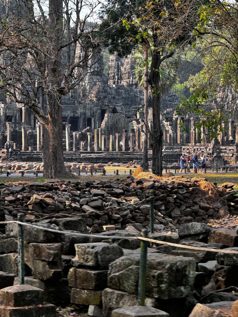 We got back into the tuk-tuk and drove another 10 or so minutes to get into the back entrance or at least where you walk (hike) to get into the back entrance. Quick history lesson. Angkor Wat started as a Hindu temple when it was built in the 12th century that became Buddhist over the years. I’m not sure how one reconciles Buddhism with all the wars that took place, but that’s for another discussion. Apparently, there were a number of kings, but J7 (J is short for an unpronounceable name that starts with J) is the main guy. He converted the people to Buddhism and built a temple, Bayan Temple, that, if I understood correctly, allowed both Hindu and Buddhism to live and pray side by side. Angkor Wat though is much more than the largest religious complex on Earth. In the mid-16th century over a million people lived around the temple complex, making it the largest city in the world at that time. Crazy, right? There’s a square moat dug by hand that surrounds Angkor Wat (1.3km by 1.5km) that provided water for the million people. Unfortunately as time passed, wars raged and the water system fell into disrepair so the king at that time moved the entire city to Phnom Penh. The temple complex was abandoned and not rediscovered until the French came upon it in the 1860’s and began putting the pieces back together that’s still going on today. It’s the largest jigsaw puzzle on the planet or maybe Lego puzzle is a better way to explain it. There are literally piles and piles of hundreds and hundreds of stones that archeologists are still trying to figure out how they fit.